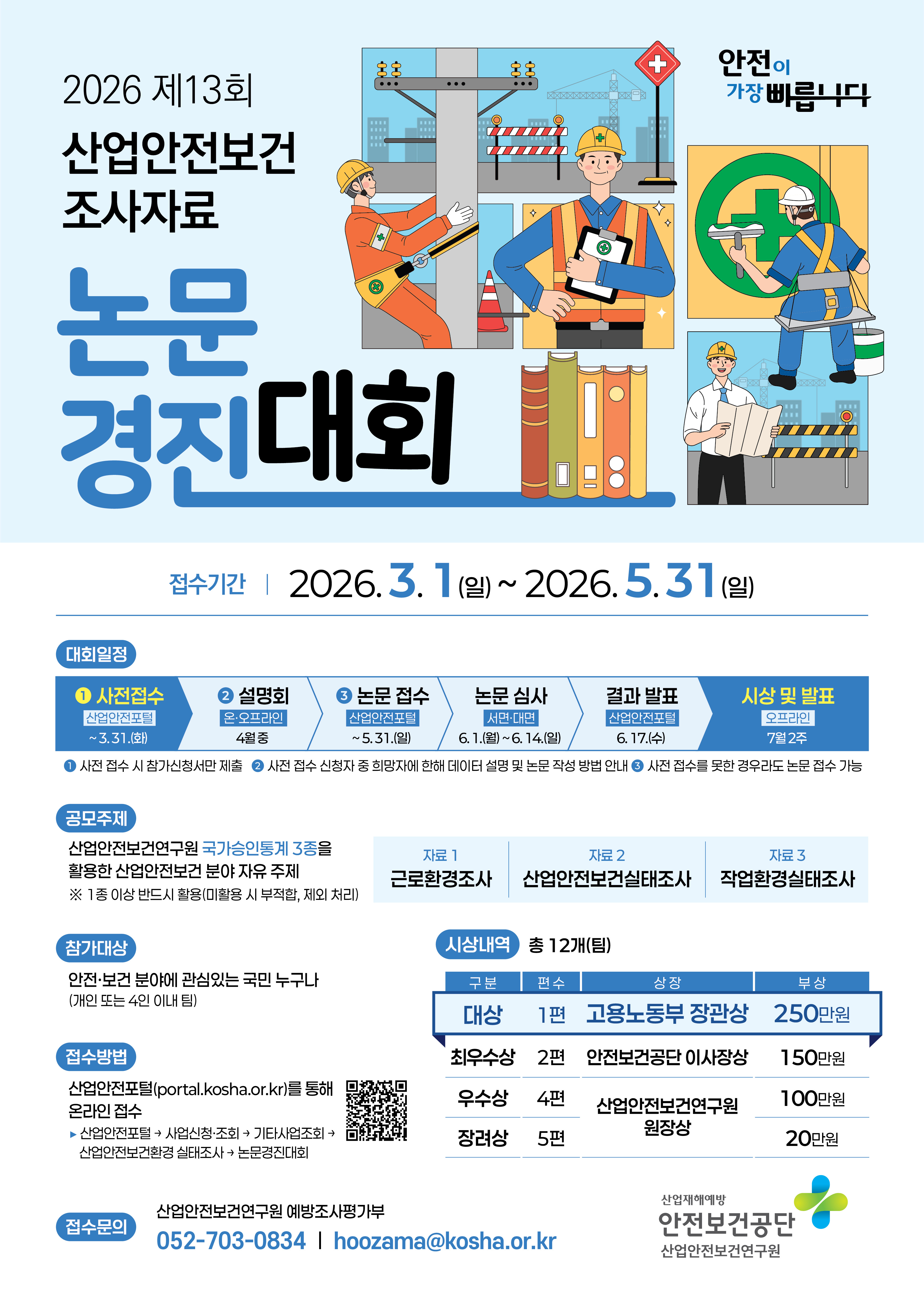 안전보건공단 산업안전보건연구원에서 「제13회 산업안전보건 조사자료 논문 경진대회」를 개최하오니 관심 있는 분들의 많은 참여 바랍니다.